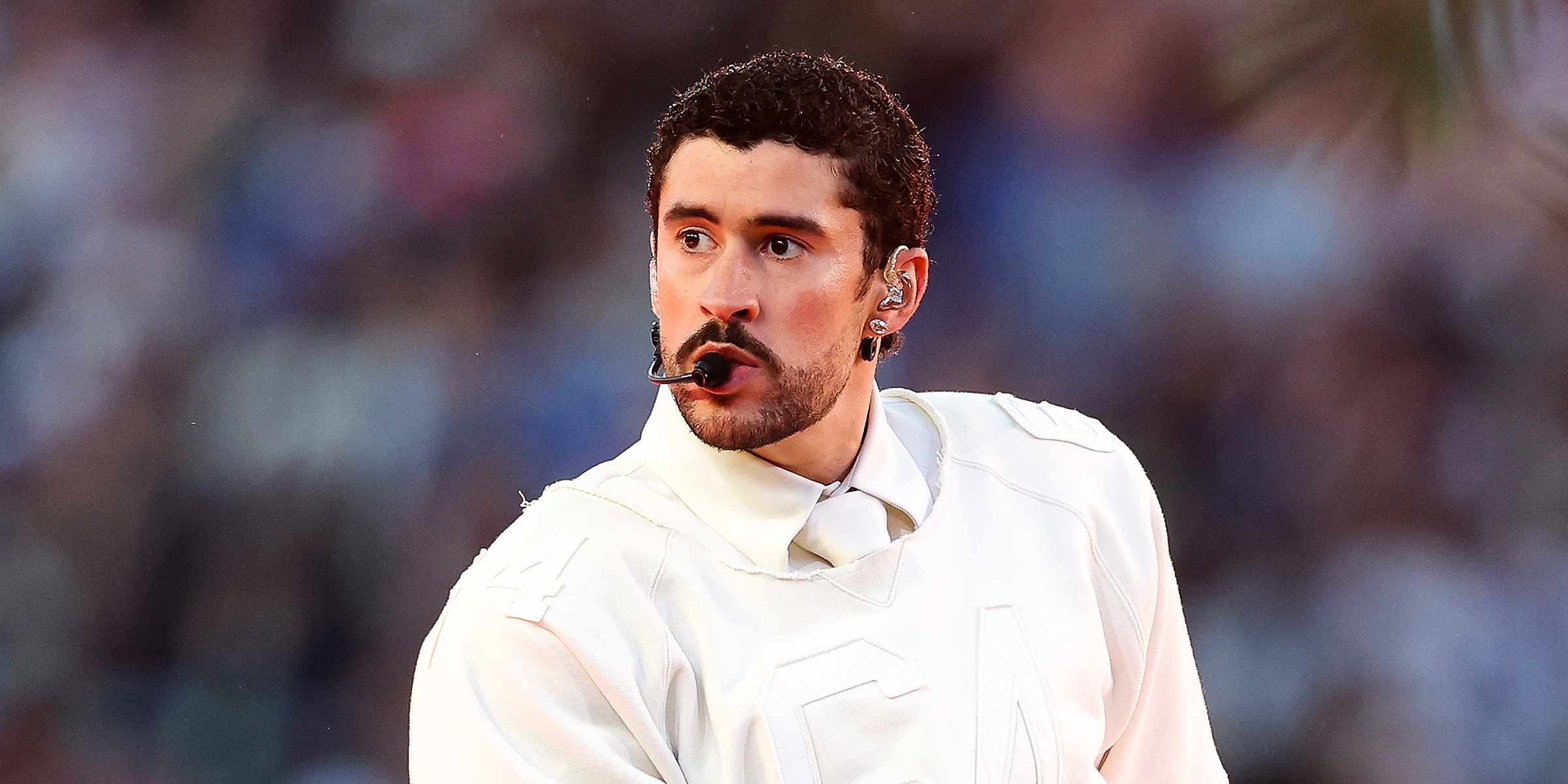 Bad Bunny performs during the Super Bowl 2026 Halftime Show, wearing an all-white outfit as he takes the stage in front of a packed stadium audience, in Santa Clara, California on February 8, 2026. | Source: Getty Images